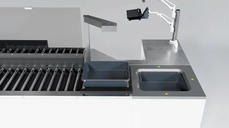 The incline module in front of the X-ray system allows for direct insertion of trays. This enables operators to quickly re-scan items.