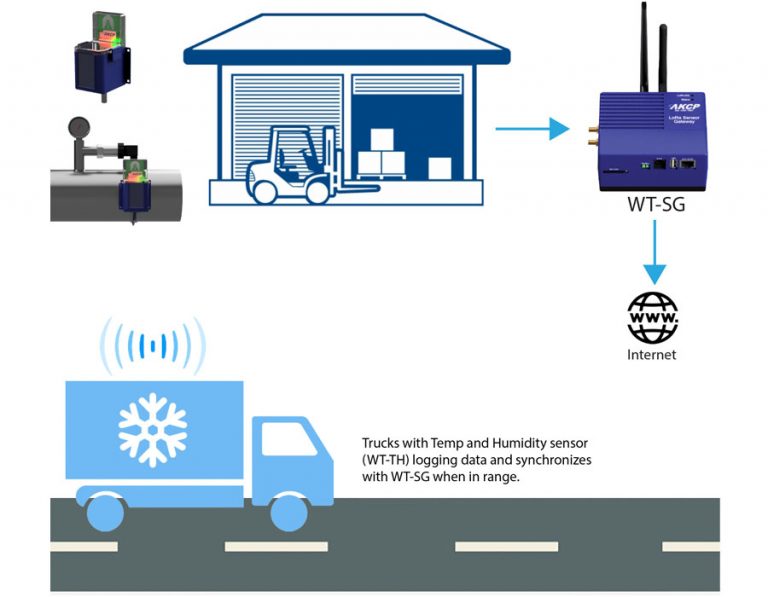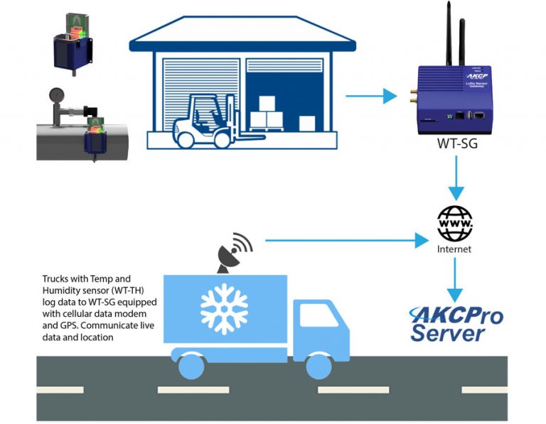 Data logging during transit is easy with wireless battery operated sensors. Data is logged and synchronizes with the AKCP Gateway when it returns to the depot. Live data is also possible with communications through cellualr data connection, together with live location via GPS.